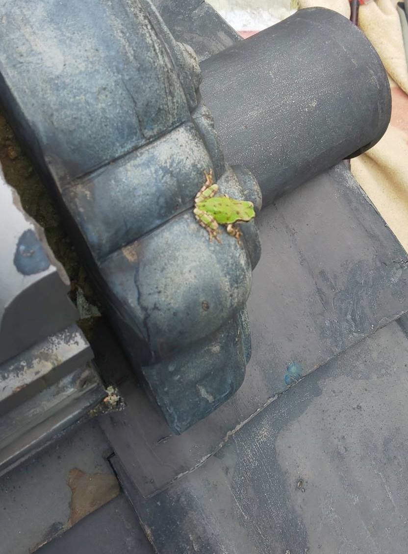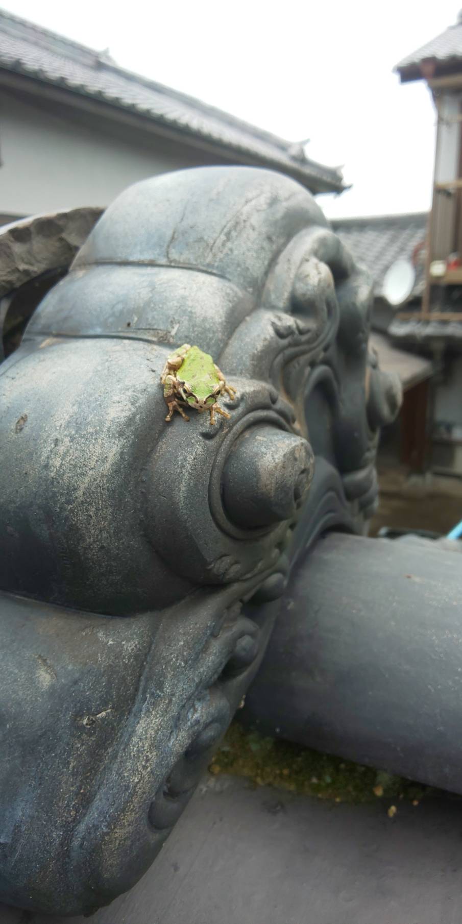 今月の写真は、鬼瓦にたたずむカエルです。
