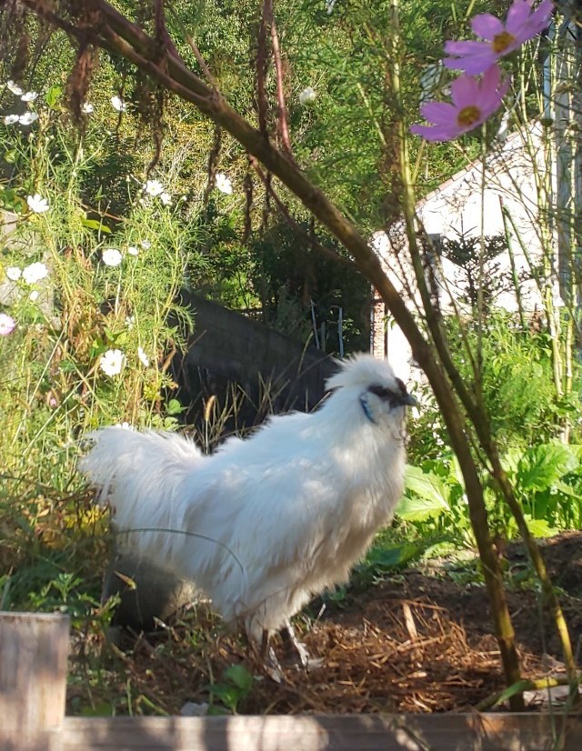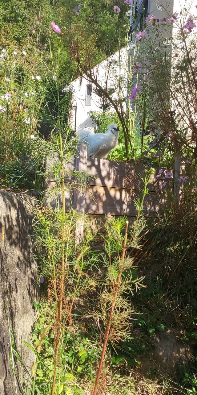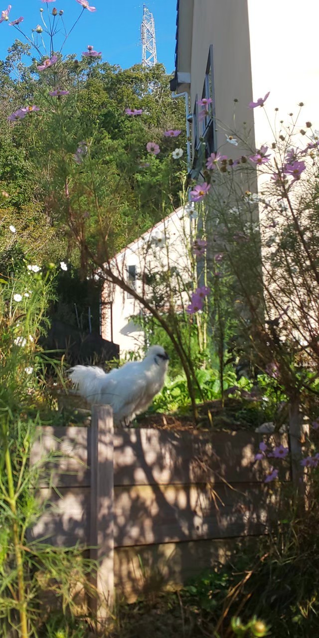 今月の写真は、現場近くで出会った、コスモスの花の横に可愛くたたずむ烏骨鶏です。